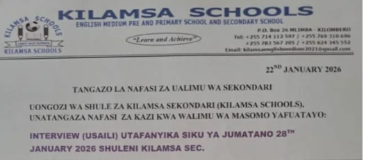 The management of Kilamsa Secondary Schools (KILAMSA SCHOOLS) hereby announces job vacancies for secondary school teachers in the following subjects: